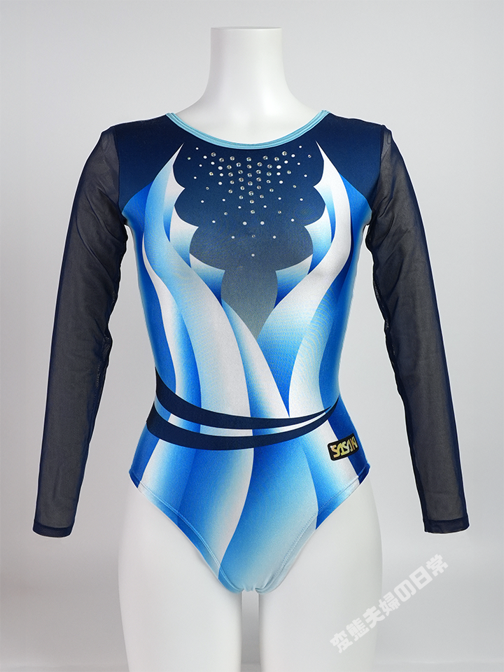 このSP-7160GLもその中の一つで、確か2016年か2017年あたりのモデルだったと記憶する。 レオタードの形状としてはU字ネックのオーソドックスなものだが、2010年代から流行しているメッシュ素材の袖を採用し、肌の色を活かした透け感がとても美しい。 そのメッシュの袖に流れるような柄が描かれたプリント生地との組合せがこれまた抜群で、加えて胸元のラインストーンが煌びやかな印象を添える。 カラーは画像のBU(ブルー)の他、P(ピンク)、G(グリーン)、N(ネイビー)、R(レッド)の5つで、そのうちG、N、Rの3色が受注生産であった。 当時、私はこのモデルを新品で購入したが、受注生産カラーのグリーンであったため、数か月待ってようやく手元に届いたものだ。 グリーンと言うとフレッシュなイメージがあるが、胸元と袖に配色された黒がデザインを引き締め、気品ある優雅な雰囲気に仕上がっているところがお気に入りだった。 残念ながらその一着は諸事情により手放してしまったが、その時の印象が忘れられず、機会があったらまた購入したいと思っていた。 あれから何年も経ってしまったが、ある日この個体を見つけて衝動買い。数年振りに思いを果たす事が出来た。 僅かにダメージがあったものの、コンディションはまずまず良好。今度は末永く大切にしていきたいと思う。 |